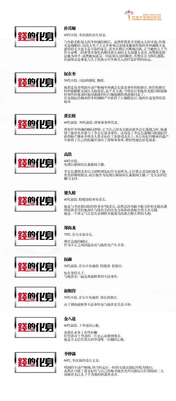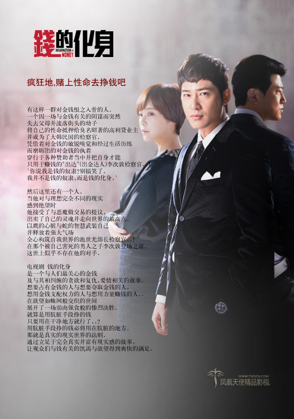 【簡介】:電視劇《錢的化身》是圍繞因為錢而失去所有的一個男人,以詼諧和諷刺的方式,刻畫了韓國的賄賂、偷稅漏稅等不正之風。